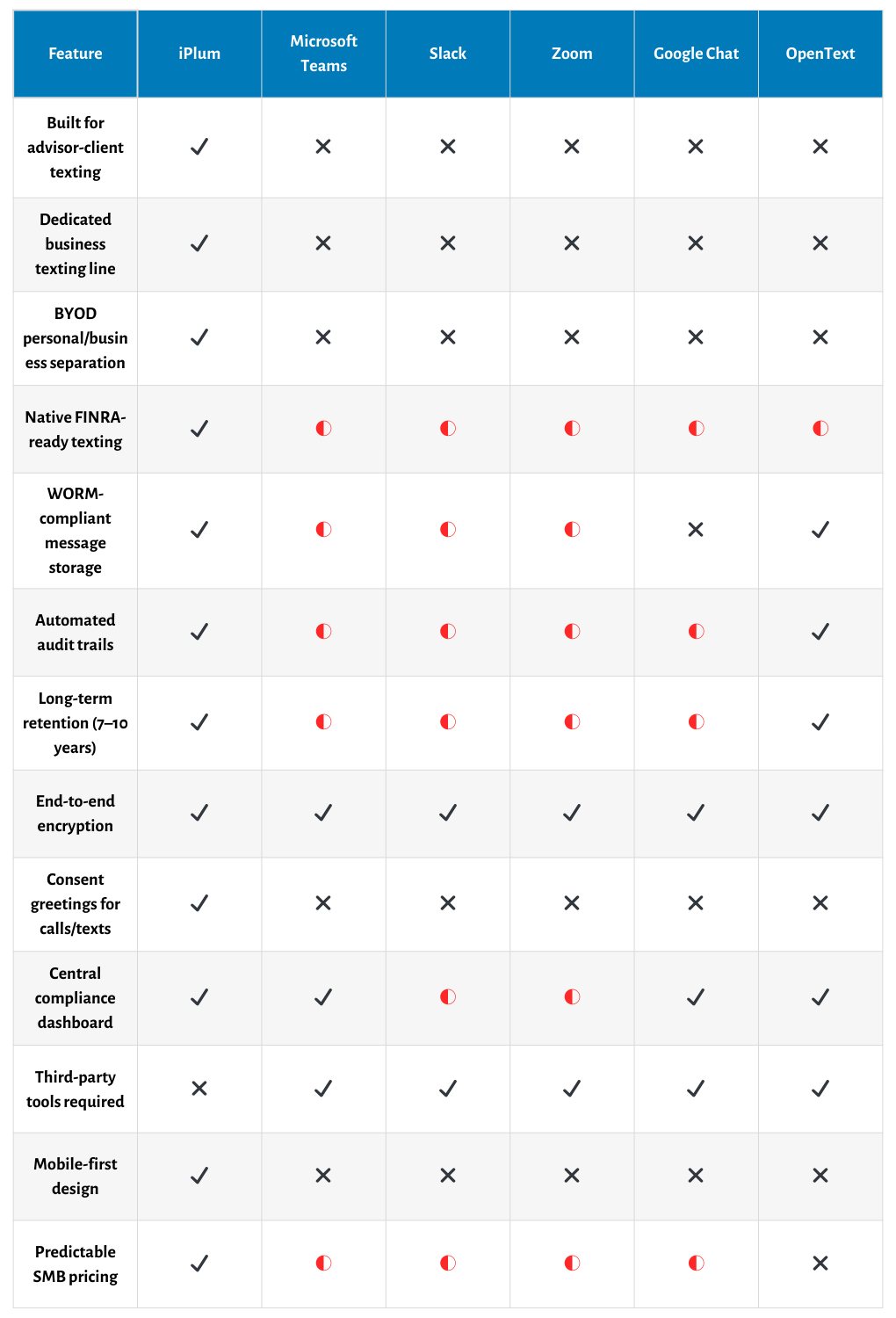 For FINRA-compliant texting, iPlum offers a mobile-first solution with long-term archiving, centralized supervision, and secure BYOD support, all at a competitive price.