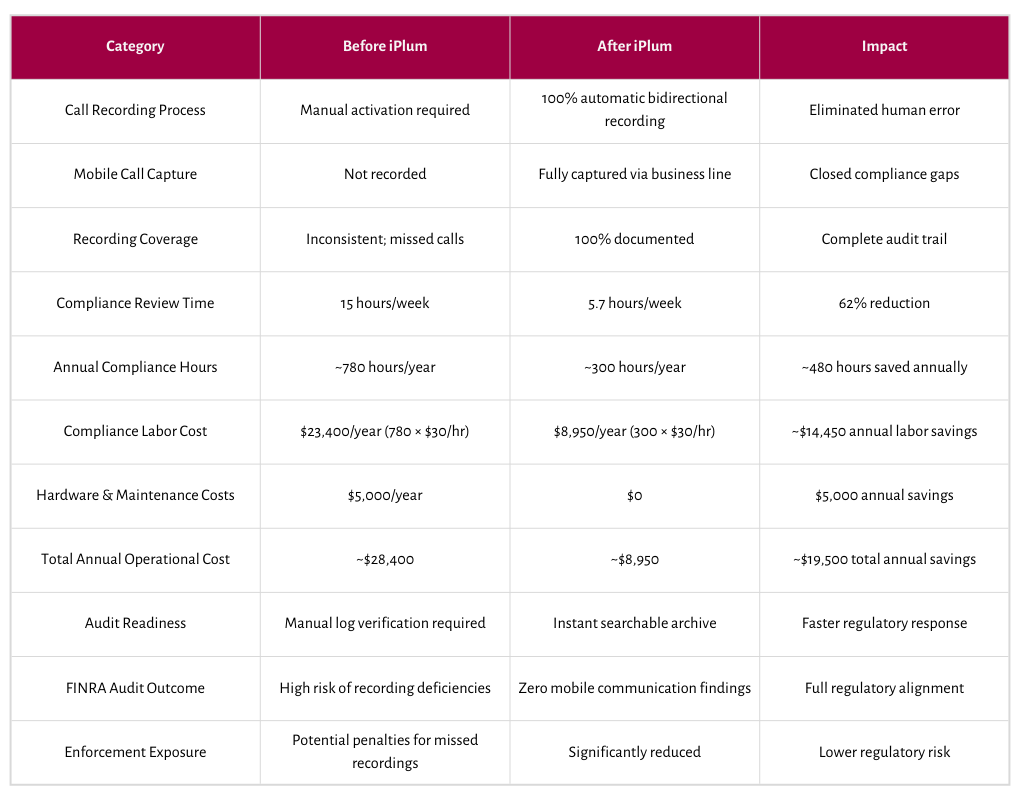 - Mobile-first compliance matched real advisor behavior: Reps were already using mobile devices. iPlum simply made those calls compliant.