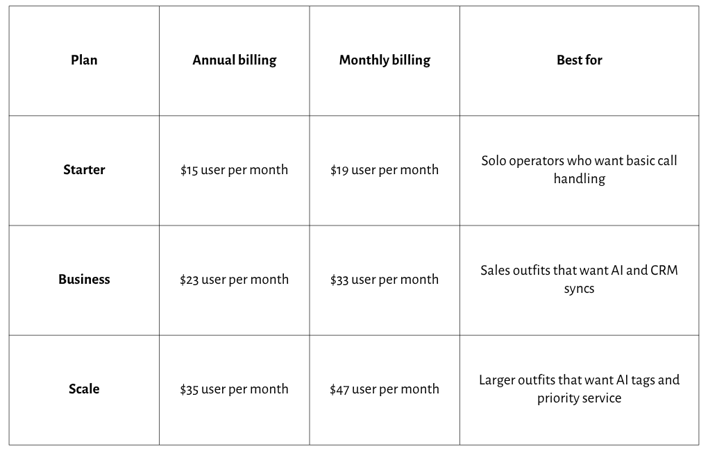 Buyers who pick Starter end up paying $23 or $35 once they need auto recording, phone menus, HubSpot sync, or full AI call summaries. Add credit overages, extra-number-per-user fees, and automated SMS charges, and the monthly bill climbs past what small businesses budgeted.