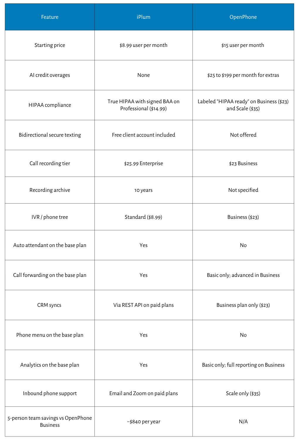 For small businesses that field patient calls, insurance inquiries, legal intake, or service dispatch, iPlum offers compliance-grade calling at half the price of OpenPhone's equivalent tier.